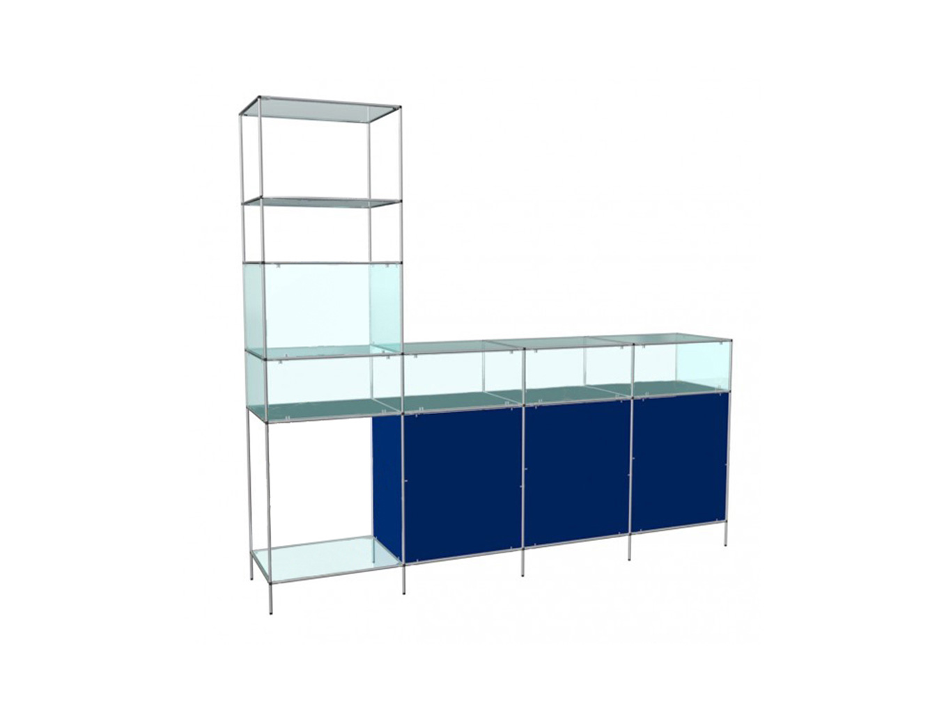 El sistema incluye accesorios para el soporte de gráficas así como de estantes y paredes que pueden ser de diversos materiales, incluyendo los transparentes para crear vitrinas. Los conectores son de color negro mate y los tubos están disponibles en color aluminio natural, negro mate e imitación de madera. Colores personalizados para la tubería son posibles en acabado de pintura en polvo.