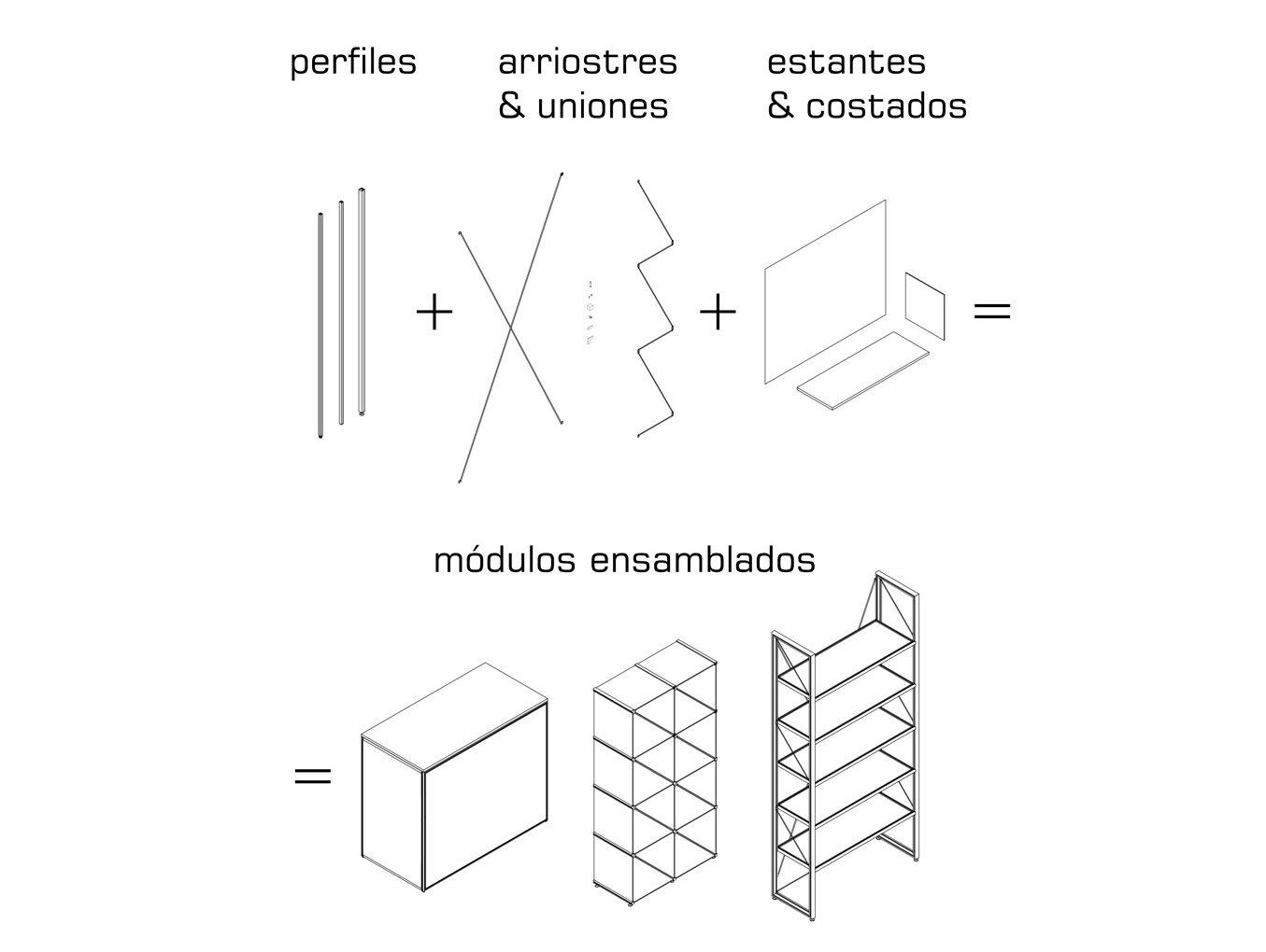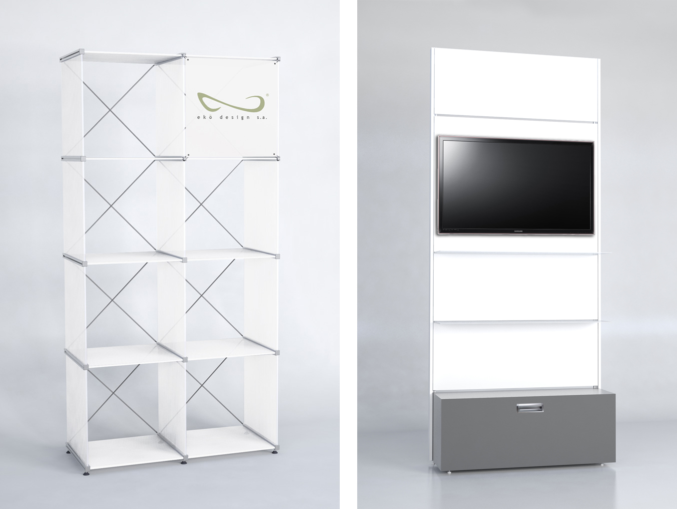 Con este sistema se pueden ensamblar de forma modular diversas estructuras como por ejemplo estantes, counters, cajas de luz, pedestales, portabanners iluminados y vitrinas. El sistema se puede ampliar libremente y personalizar de acuerdo a sus necesidades. Además permite la integración de iluminación led y gráficas.